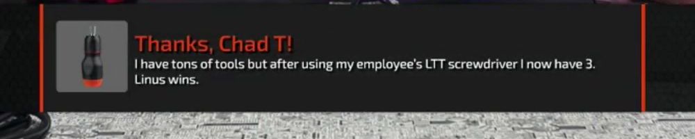 Thanks, Chad T! I have tons of tools but after using my employee's LTT screwdriver I now have 3. Linus wins.