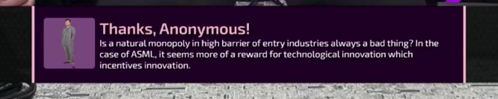Thanks, Anonymous! Is a natural monopoly in high barrier of entry industries always a bad thing? In the case of ASML, it seems more of a reward for technological innovation which incentives innovation.