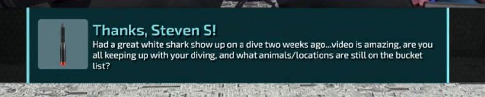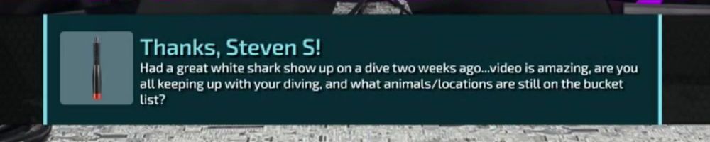 Thanks, Steven S! Had a great white shark show up on a dive two weeks ago...video is amazing, are you all keeping up with your diving, and what animals/locations are still on the bucket list?