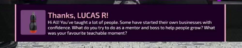 Thanks, LUCAS R! Hi All! You've taught a lot of people. Some have started their own businesses with confidence. What do you try to do as a mentor and boss to help people grow? What was your favourite teachable moment?