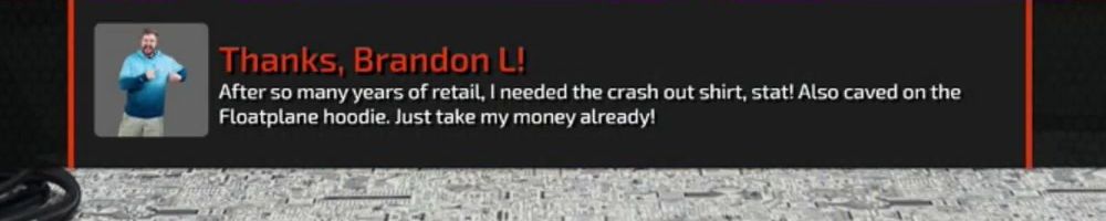 Thanks, Brandon L! After so many years of retail, I needed the crash out shirt, stat! Also caved on the Floatplane hoodie. Just take my money already!