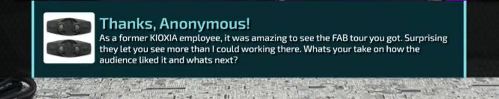 Thanks, Anonymous! As a former KIOXIA employee, it was amazing to see the FAB tour you got. Surprising they let you see more than I could working there. Whats your take on how the audience liked it and whats next?