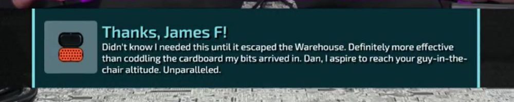 Thanks, James F! Didn't know I needed this until it escaped the Warehouse. Definitely more effective than coddling the cardboard my bits arrived in. Dan, I aspire to reach your guy-in-the-chair altitude. Unparalleled.