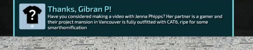 Thanks, Gibran P! Have you considered making a video with Jenna Phipps? Her partner is a gamer and their project mansion in Vancouver is fully outfitted with CAT6, ripe for some smarthomification