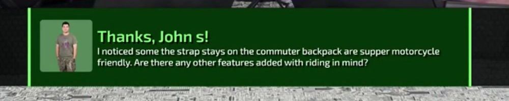 Thanks, John s! I noticed some the strap stays on the commuter backpack are supper motorcycle friendly. Are there any other features added with riding in mind?