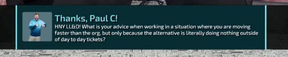 Thanks, Paul C! HNY LL&D! What is your advice when working in a situation where you are moving faster than the org, but only because the alternative is literally doing nothing outside of day to day tickets?