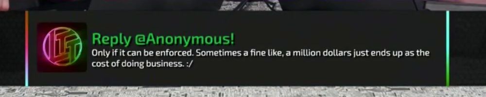 Reply @Anonymous! Only if it can be enforced. Sometimes a fine like, a million dollars just ends up as the cost of doing business. :/