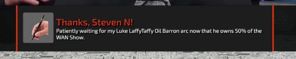 Thanks, Steven N! Patiently waiting for my Luke LaffyTaffy Oil Barron arc now that he owns 50% of the WAN Show.