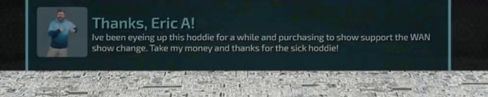 Thanks, Eric A! Ive been eyeing up this hoddie for a while and purchasing to show support the WAN show change. Take my money and thanks for the sick hoddie!