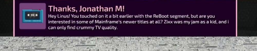 Thanks, Jonathan M! Hey Linus! You touched on it a bit earlier with the ReBoot segment, but are you interested in some of Mainframe's newer titles at all? Zixx was my jam as a kid, and i can only find crummy TV quality.