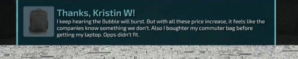Thanks, Kristin W! I keep hearing the Bubble will burst. But with all these price increase, it feels like the companies know something we don't. Also I boughter my commuter bag before getting my laptop. Opps didn't fit.