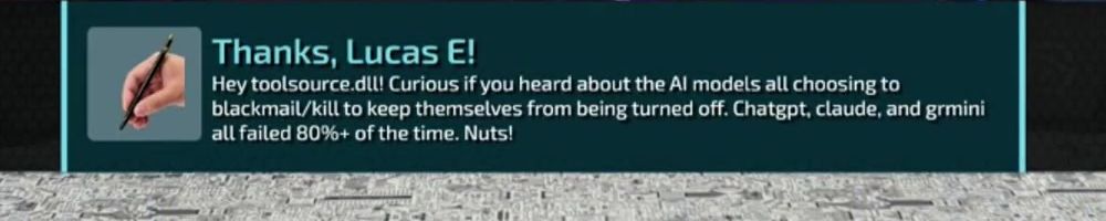 Thanks, Lucas E! Hey toolsource.dll! Curious if you heard about the Al models all choosing to blackmail/kill to keep themselves from being turned off. Chatgpt, claude, and grmini all failed 80%+ of the time. Nuts!