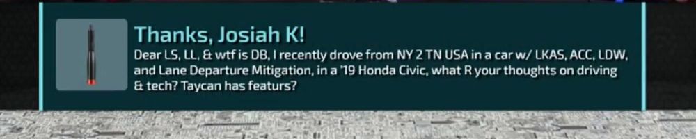 Thanks, Josiah K! Dear LS, LL, & wtf is DB, I recently drove from NY 2 TN USA in a car w/ LKAS, ACC, LDW, and Lane Departure Mitigation, in a '19 Honda Civic, what R your thoughts on driving & tech? Taycan has featurs?