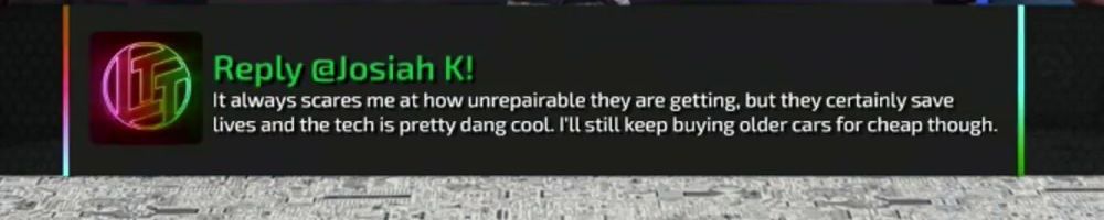 Reply @Josiah K! It always scares me at how unrepairable they are getting, but they certainly save lives and the tech is pretty dang cool. I'll still keep buying older cars for cheap though.