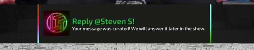 Reply @Steven S! Your message was curated! We will answer it later in the show.