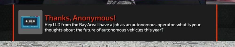 Thanks, Anonymous! Hey LLD from the Bay Area, i have a job as an autonomous operator. what is your thoughts about the future of autonomous vehicles this year?