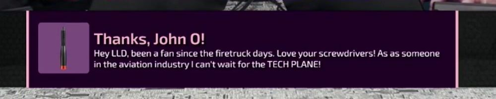 Thanks, John O! Hey LLD, been a fan since the firetruck days. Love your screwdrivers! As as someone in the aviation industry I can't wait for the TECH PLANE!