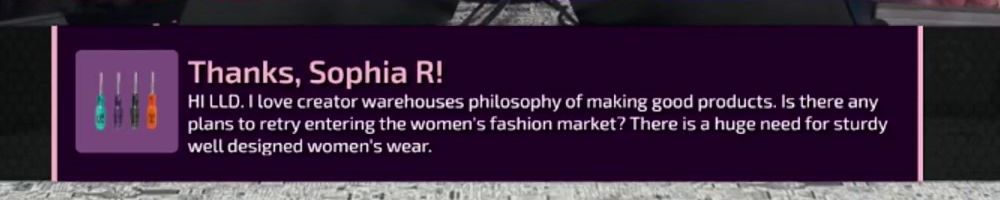 Thanks, Sophia R! HI LLD. I love creator warehouses philosophy of making good products. Is there any plans to retry entering the women's fashion market? There is a huge need for sturdy well designed women's wear.