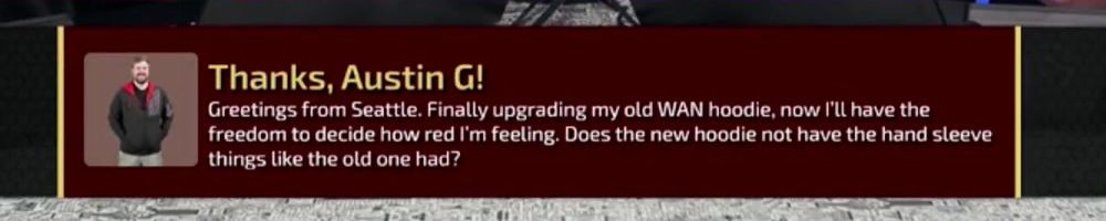 Thanks, Austin G! Greetings from Seattle. Finally upgrading my old WAN hoodie, now I'll have the freedom to decide how red I'm feeling. Does the new hoodie not have the hand sleeve things like the old one had?
