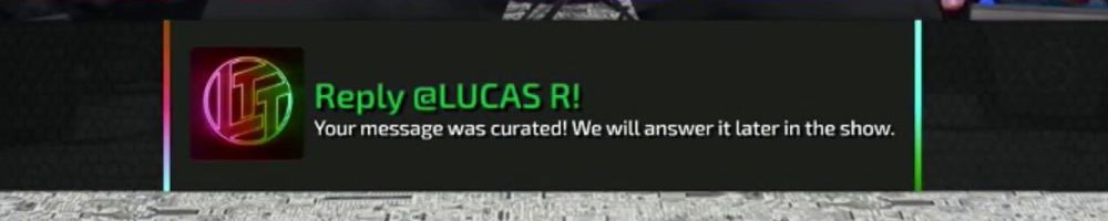 Reply @LUCAS R! Your message was curated! We will answer it later in the show.