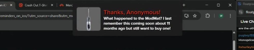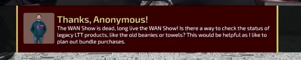 Hint: Use CTRL + F to search messages in this show, or use Whenplane's WAN Show Search tool to search for messages in all shows. Make sure that the "Merch Messages" box is checked when you search for something.