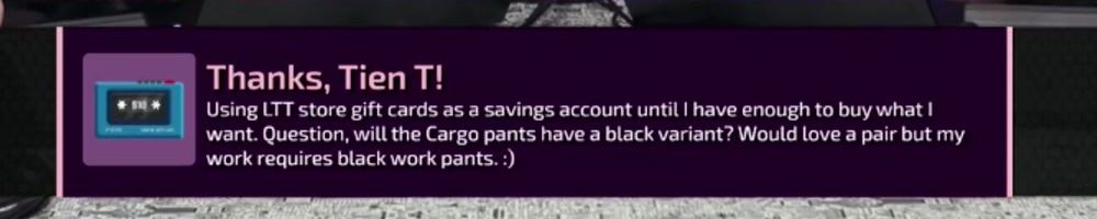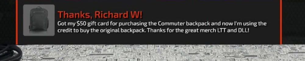 Thanks, Richard W! Got my $50 gift card for purchasing the Commuter backpack and now I'm using the credit to buy the original backpack. Thanks for the great merch LTT and DLL!