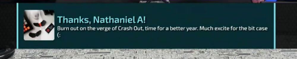 Thanks, Nathaniel A! Burn out on the verge of Crash Out, time for a better year. Much excite for the bit case (: