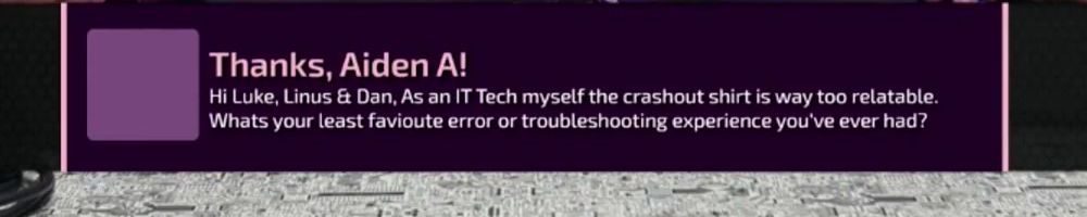 Thanks, Aiden A! Hi Luke, Linus & Dan, As an IT Tech myself the crashout shirt is way too relatable. Whats your least favioute error or troubleshooting experience you've ever had?