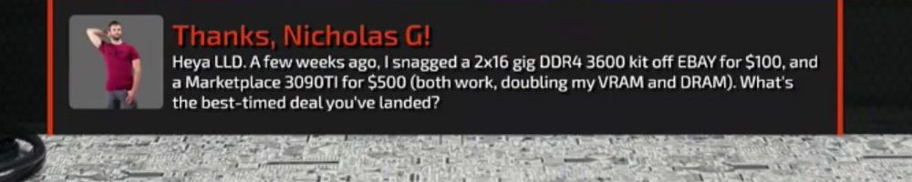 Thanks, Nicholas G! Heya LLD. A few weeks ago, I snagged a 2x16 gig DDR4 3600 kit off EBAY for $100, and a Marketplace 3090TI for $500 (both work, doubling my VRAM and DRAM). What's the best-timed deal you've landed?