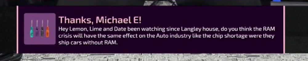 Thanks, Michael E! Hey Lemon, Lime and Date been watching since Langley house, do you think the RAM crisis will have the same effect on the Auto industry like the chip shortage were they ship cars without RAM.