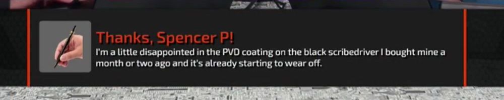Thanks, Spencer P! I'm a little disappointed in the PVD coating on the black scribdriver I bought mine a month or two ago and it's already starting to wear off.