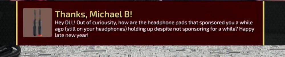 Thanks, Michael B! Hey DLL! Out of curiousity, how are the headphone pads that sponsored you a while ago (still on your headphones) holding up despite not sponsoring for a while? Happy late new year!