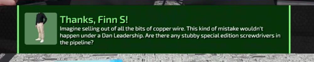 Imagine selling out of all the bits of copper wire. This kind of mistake wouldn't happen under a Dan Leadership. Are there any stubby special edition screwdrivers in the pipeline?