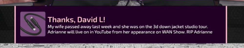 My wife passed away last week and she was on the 3d down jacket studio tour. Adrianne will live on in YouTube from her appearance on WAN Show. RIP Adrianne