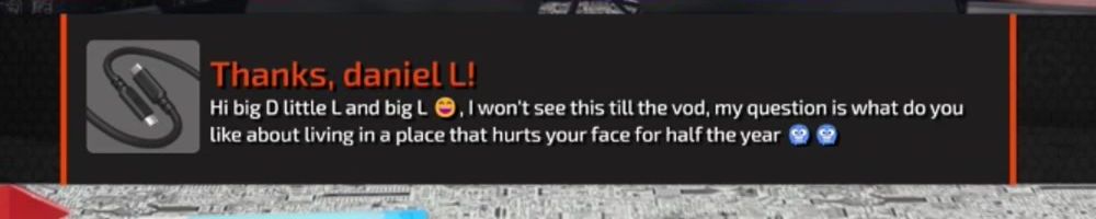 Hi big D little L and big L 😂, I won't see this till the vod, my question is what do you like about living in a place that hurts your face for half the year 🥶🥶
