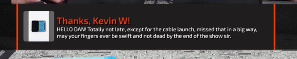 HELLO DAN! Totally not late, except for the cable launch, missed that in a big way, may your fingers ever be swift and not dead by the end of the show sir.