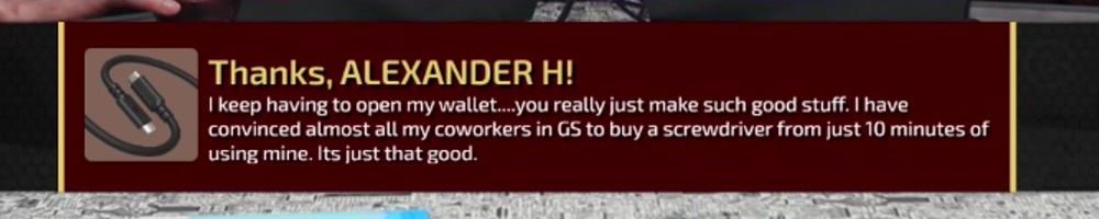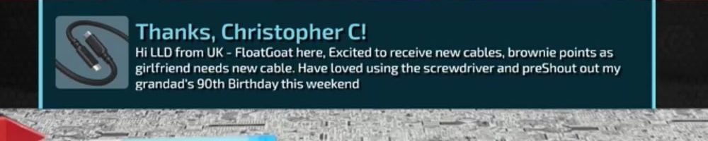 Hi LLD from UK - FloatGoat here, Excited to receive new cables, brownie points as girlfriend needs new cable. Have loved using the screwdriver and preShout out my grandad's 90th Birthday this weekend