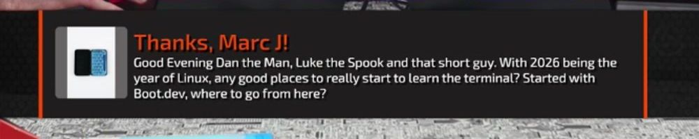 Good Evening Dan the Man, Luke the Spook and that short guy. With 2026 being the year of Linux, any good places to really start to learn the terminal? Started with Boot.dev, where to go from here?