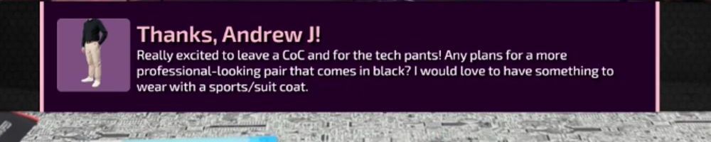 Really excited to leave a CoC and for the tech pants! Any plans for a more professional-looking pair that comes in black? I would love to have something to wear with a sports/suit coat.