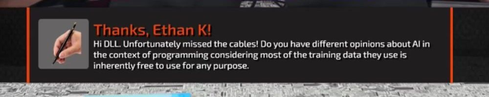 Hi DLL. Unfortunately missed the cables! Do you have different opinions about AI in the context of programming considering most of the training data they use is inherently free to use for any purpose.