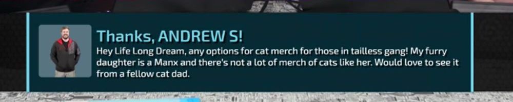 Hey Life Long Dream, any options for cat merch for those in tailless gang! My furry daughter is a Manx and there's not a lot of merch of cats like her. Would love to see it from a fellow cat dad.