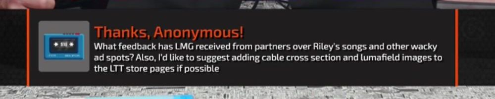 What feedback has LMG received from partners over Riley's songs and other wacky ad spots? Also, I'd like to suggest adding cable cross section and lumafield images to the LTT store pages if possible