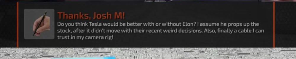 Do you think Tesla would be better with or without Elon? I assume he props up the stock, after it didn't move with their recent weird decisions. Also, finally a cable I can trust in my camera rig!