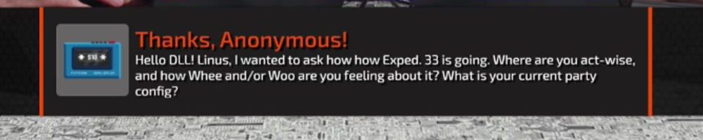 Hello DLL! Linus, I wanted to ask how Exped. 33 is going. Where are you act-wise, and how Whee and/or Woo are you feeling about it? What is your current party config?