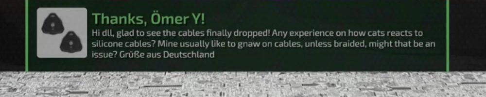 Hi dIL, glad to see the cables finally dropped! Any experience on how cats reacts to silicone cables? Mine usually like to gnaw on cables, unless braided, might that be an issue? Grüße aus Deutschland