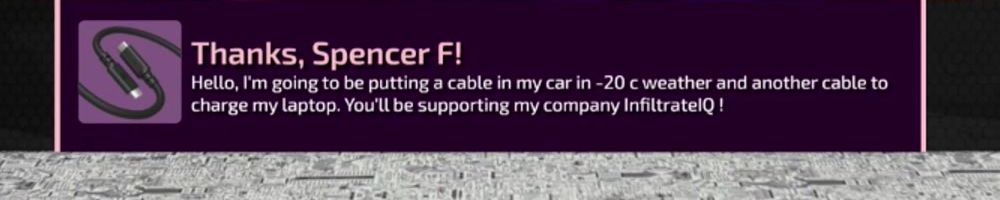 Hello, I'm going to be putting a cable in my car in -20 c weather and another cable to charge my laptop. You'll be supporting my company InfiltrateIQ !
