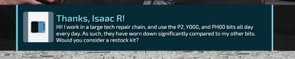 Hi! I work in a large tech repair chain, and use the P2, Y000, and PH00 bits all day every day. As such, they have worn down significantly compared to my other bits. Would you consider a restock kit?