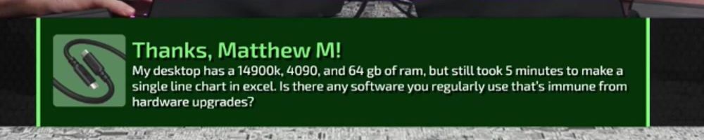 My desktop has a 14900k, 4090, and 64 gb of ram, but still took 5 minutes to make a single line chart in excel. Is there any software you regularly use that's immune from hardware upgrades?