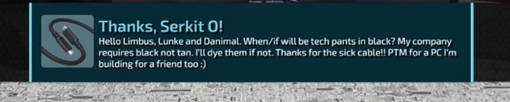 Hello Limbus, Lunke and Danimal. When/if will be tech pants in black? My company requires black not tan. I'll dye them if not. Thanks for the sick cable!! PTM for a PC I'm building for a friend too :)