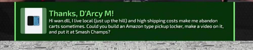 Hi wan.dll, I live local (just up the hill) and high shipping costs make me abandon carts sometimes. Could you build an Amazon type pickup locker, make a video on it, and put it at Smash Champs?